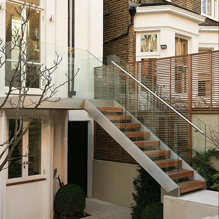 Stringers spaced about 12 to 16 in. Cut with 6 12 in rise and 10 in tread. Wood decking and railings.